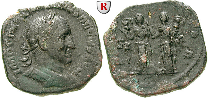 Zur Münzgeschichte: Seine Liebe zur Tradition zeigt die Kaiserreihe, die er als Gedenkprägung (von Augustus bis Severus Alexander) schlagen ließ. Seine Sesterzen haben häufig, wie bei seinem Vorgänger Philippus Arabs, annähernd viereckige Form, weil sie durch Beschneidung reduziert wurden (Inflation). Die Einführung eines "Doppelsesterzes" (Strahlenkrone des Herrschers), die auf Dauer erfolglos blieb, scheint wohl die vorangegangene Notmaßnahme (Schrötlingsbeschneidung) ausgleichen zu wollen.