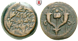 Judas Aristobulus I. 104-103 v.Chr. AE-Prutah 14 mm 104-103 v.Chr. Jerusalem. Schrift im Kranz / Granatapfel zw. zwei Füllhörnern. Hendin 465; sehr schön