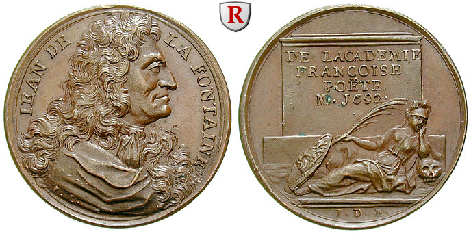 de la Fontaine, Jean - Französischer Schriftsteller 1621-1695. Bronze-Bronzemedaille 28,2 mm o.J. Suitenmedaille (von J.Dassier) Büste rechts / Athena liegt vor einem Grabmal. vorzüglich-stempelfrisch
