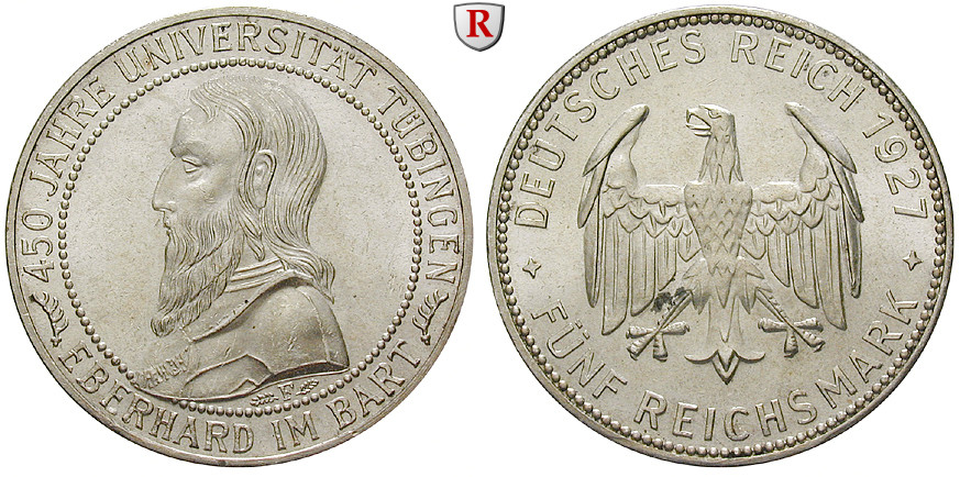 5 Reichsmark 1927 F. Uni Tübingen. J. 329; vorzüglich, Kratzer auf Vs.; Rs. l. belegt