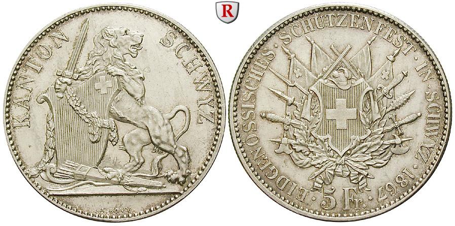 5 Franken 1867. Schwyz. HMZ 2-1343g; fast stempelfrisch