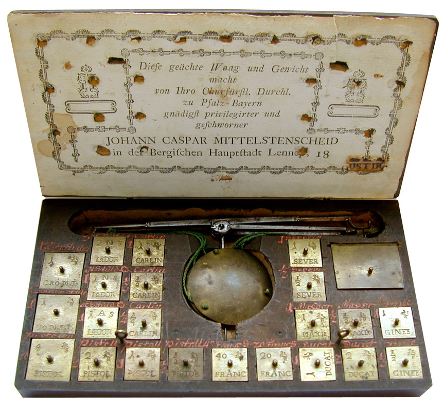 Johann Caspar Mittelstenscheidt in Lennep 1764-1819. Münzwaage 18 (nach 1803). Dunkel gebeizter Holzkasten mit zwei Messingschließen, Maße: 185 x 105 x 22 mm. Im Deckelinneren großes Meisteretikett und zwei Brandstempel IUSTIRT. Waage aus Stahl mit Schwanenhalsenden und mit zwei runden Messingwaagschalen an grünen Bändern, die Gewichtsmulden mit roter Tusche beschriftet. Die Waage ist komplett mit 20 Gold- und zwei Silbermünzgewichten, mit Ausnahme der Louis dor-Gewichte alle mit dem bergischen Löwen punziert. Ausgleichsgewichte in der verschließbaren Mulde fehlen. Unshelm 16.5; vorzüglich