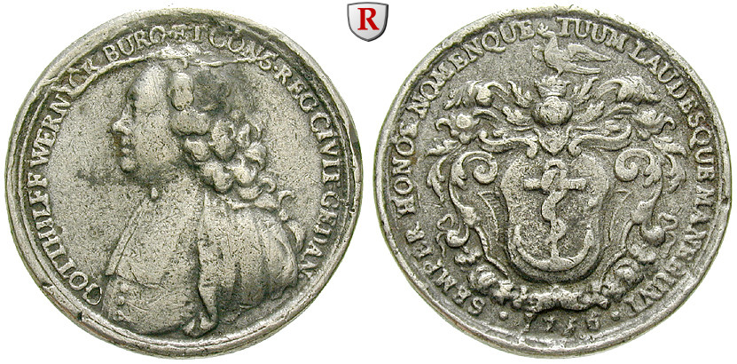Wernick, Gotthilf - Ratsherr in Danzig 1720-1773. Zinn-Zinnmedaille 1756. (von Dassier) auf seine Wahl zum Bürgermeister von Danzig. Büste im Habit l. / SEMPER HONOS NOMENQUE TUUM LAUDESQUE MANEBUNT Schild mit einem schlangenumwundenem Anker in Blumenverzierung. 34,23 mm, 13,31 g, sehr schön