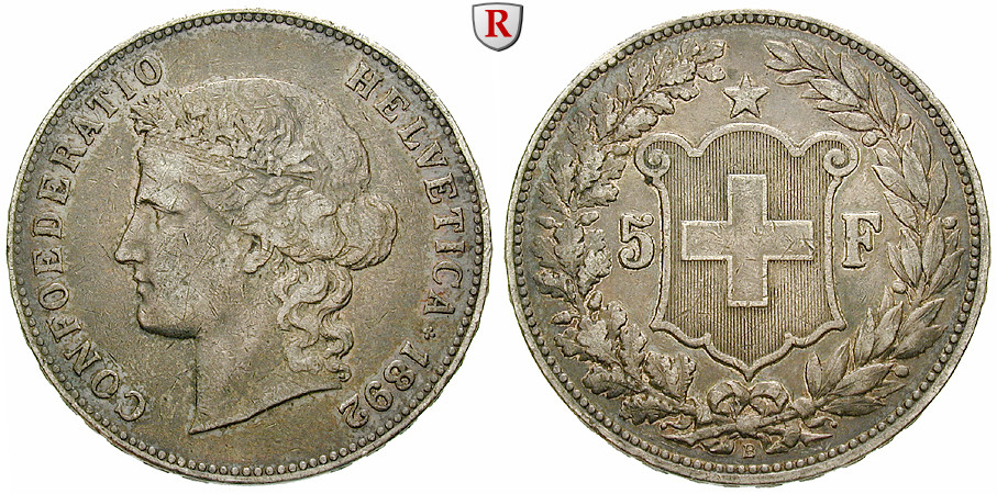 5 Franken 1892 B. Frauenkopf. HMZ 2-1198e; sehr schön, min. Rdf.