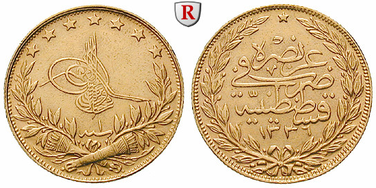 Mohammed VI. 1918-1922. 100 Piaster 6,62 g fein, 1918 Konstantinopel. Jahr 1, Gelbgold. Friedb. 72; GOLD, sehr schön