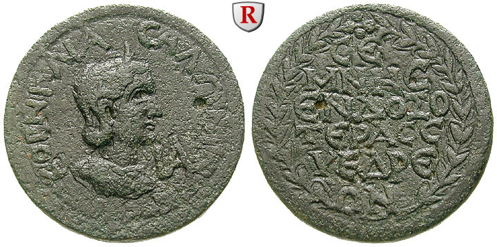 Salonina, Frau des Gallienus +268. AE-11 Assaria 30 mm. Drapierte Büste r. mit Diadem, Wertzeichen IA / Fünf Zeilen Schrift im Kranz. Ziegler, Münzen 157 (dieses Exemplar); sehr schön, schwarze Patina