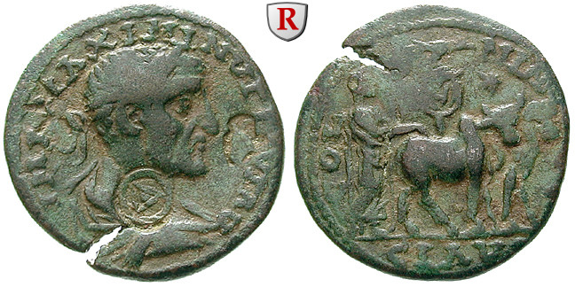 Maximinus I. 235-238. Bronze 27 mm. Drapierte Büste r. mit Lorbeerkranz; Gegenstempel: Delta im Kreis, Stierprotome / Koloniegründer pflügt mit Ochsengespann, dahinter Feldzeichen. Ziegler, Münzen 341 (dieses Exemplar); sehr schön