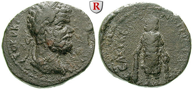 Septimius Severus 193-211. Bronze 27 mm. Büste r. mit Lorbeerkranz / Herakles hält Keule und Löwenfell. Ziegler, Münzen 429 (dieses Exemplar); sehr schön