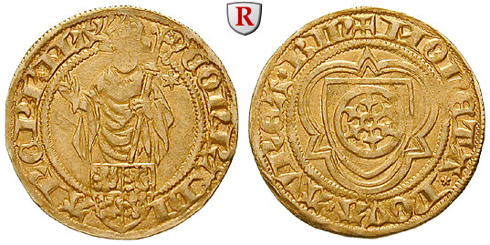 Konrad III. von Dhaun 1419-1434. Goldgulden o.J. (1427-1428) Bingen. Stehender Erzbischof hinter dem Wappen von Dhaun, Stern im r. Feld / Wappen im Dreipaß. Friedb. 1621; GOLD, sehr schön