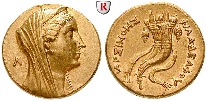 Arsinoe II., Frau des Ptolemaios II. gestorben ca. 270 v.Chr. Oktadrachme (Mnaieion) 27 mm 253-246 v. Chr. Alexandria. Verschleierter Kopf der Arsinoe II. r., mit Diadem und Stephane, dahinter Kontrollzeichen lambda / Doppelfüllhorn mit Früchten, verziert mit einer Königsbinde. SNG Cop. 321vgl.; GOLD, fast vorzüglich