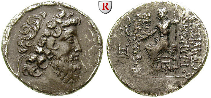 Demetrios II., 2. Regierung 129-125 v.Chr. Tetradrachme 29 mm Jahr 185-186 = 128-126 v.Chr. Damaskus. Kopf r. mit Diadem / Thronender Zeus hält Zepter und Nike, Beizeichen Monogramme. SNG Spear 2267vgl.; sehr schön + / sehr schön, dunkle Patina