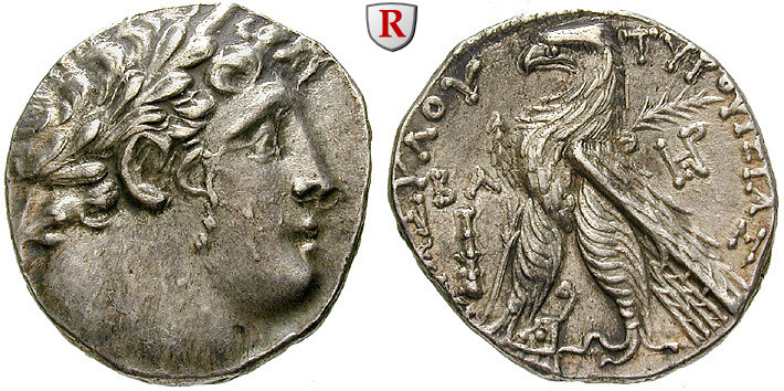 Schekel 30 mm Jahr 32 = 95-94 v.Chr. Kopf des Herakles Melkarth r. mit Lorbeerkranz / Adler mit Palmzweig l. auf Prora; in den Feldern: Keule, Datierung und Monogramm, zwischen den Beinen des Adlers phönizischer Buchstabe. BMC 120; fast vorzüglich