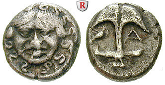 Drachme 13 mm um 410-350 v.Chr. Gorgoneion / Anker zwischen A und Garnele. SNG BM 153-156; sehr schön + / sehr schön, Druckstelle auf Rs.