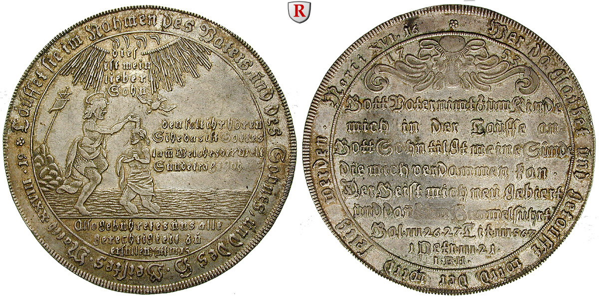 Tauftaler 1753 Zellerfeld. Münzmeister Johann Benjamin Hecht. Taufe Christi im Jordan / Schrift. Katsouros 23; sehr schön - vorzüglich, leichte Tönung