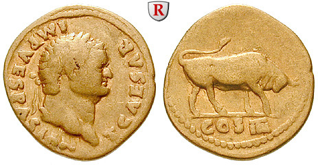 Zur Münzgeschichte: Die ersten Münzen mit dem Portrait Titus' wurden bereits 69 geprägt, als er noch den Titel Caesar trug. Während seiner kurzen Regierungszeit als Augustus fallen besonders zwei Münzreihen ins Auge. Die Edelmetallprägung des Jahres 80 zeigt fast ausschließlich die heiligen Lagerstätten römischer Gottheiten und beigegebene Symbole benennen die jeweiligen Götter. Ein Blitz auf einem Thron steht für das "pulvinar Jupiters und Junos", der um einen Anker gewundene Delphin ist das Symbol des Meeresgottes Neptun. Diese Münzreihe wurde geprägt, um die römischen Götter nach der Katastrophe des Vesuvausbruchs gnädig zu stimmen.