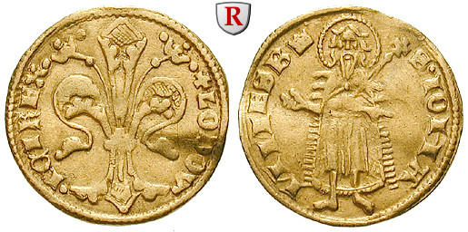 Ludwig I. 1342-1382. Goldgulden o.J. (1342-1353) Buda. Florentiner Lilie / Stehender St. Johann Baptist. Kammergraf Lorandus. Friedb. 3; GOLD, sehr schön