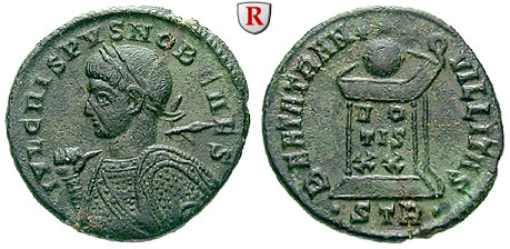 Zur Münzgeschichte: Von Crispus gibt es fast nur Bronzemünzen, die in Rom und den anderen Reichsmünzstätten geprägt wurden. Sein Portrait fällt je nach Münzstätte recht unterschiedlich aus.