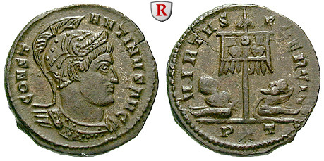 Alleinherrscher des römischen Reiches. Förderer des Christentums, geehrt als der Große. Als sein Vater Constantius Chlorus, Caesar in der 1.Tetrarchie unter Diocletianus und Maximianus Herculius, Theodora, die Stieftochter des Maximianus Herculius, heiratete, begab sich der unehelich geborene CONSTANTINUS nach einem Aufenthalt in Gallien an den Hof des Diocletianus in Nicomedia (Kleinasien in der heutigen Türkei). Nach der Abdankung des Diocletianus im Jahre 305 kehrte Constantinus zu seinem Vater nach Gallien und Britannien zurück und wurde nach dessen Tod (306) von den Truppen dort zum neuen Augustus ausgerufen. Er fand keine Zustimmung des Augustus Galerius, der Severus II. zu seinem Mitaugustus machte und Constantinus nur als Caesar akzeptierte. Erst im Jahre 310 war Constantinus allgemein anerkannter Mitkaiser neben Galerius Maximianus, Maximinus Daia und Licinius I. (4 Augusti) und dem umstrittenen Augustus Maxentius in Rom.