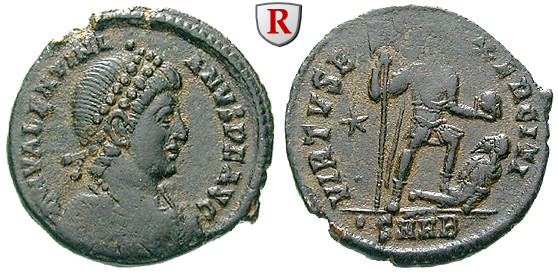 Zur Münzgeschichte: Valentinianus II. nennt sich auf seinen Münzen häufig ebenso wie sein Vater D N VALENTINIANVS P F AVG. Die Uniformität der Portraits in der Spätantike macht die Unterscheidung schwierig. Der Kopf Valentinianus II. ist etwas schmaler gezeichnet und die Gesichtszüge sind jünger. Wenn allerdings keine Vergleichsstücke vorliegen, sind alleine am Portrait die Münzen von Vater und Sohn kaum zu unterscheiden. Natürlich gibt es genügend Fachbücher, in der die spätantike Münzprägung im Zusammenhang behandelt wird und die eine exakte Zuordnung der Münzen sicherstellen.