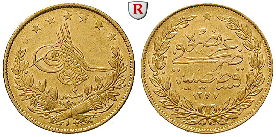 Abdul Aziz 1861-1876. 100 Piaster 6,62 g fein, 1861 (AH 1278) Konstantinopel. Jahr 2. Friedb. 25; GOLD, sehr schön - vorzüglich, Schötlingsfehler