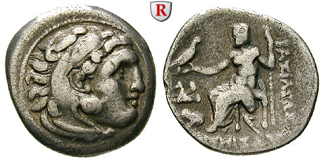 Lysimachos 323-281 v.Chr. Drachme 299-297 v.Chr. Lampsakos. Kopf des Herakles r. mit Löwenfell / Thronender Zeus l., hält Zepter und Adler; im l. Feld Pegasusvorderteil über Löwenvorderteil. Thomp. 35; sehr schön