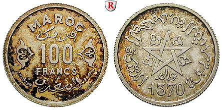 Mohammed ben Yussuf 1927-1956. 100 Francs 1950/51 (1370 AH) Paris. ESSAI. KM E40; stempelfrisch