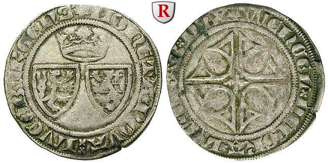 Wenzel I. 1353-1383. Blan-gros o.J. Luxemburg. Kreuz WENCEL DEI GRA LVC BRAB DVX / MONETA NOVA LVCEBVRGENS Krone über Wappen von Böhmen und Luxemburg. Weiller 147; sehr schön