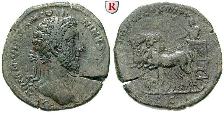 Zur Münzgeschichte: Die Münzprägung des Commodus unterteilt sich in drei signifikante Abschnitte. 175 bis 177 prägte er als Caesar. Die Münzen zeigen ein jugendliches Portrait, der Kopf trägt meistens keinen Lorbeerkranz. 177 bis 180 prägte Commodus als Augustus und Mitregent des Marcus Aurelius. Das Portrait zeigt noch immer recht jugendliche Züge, der Kopf ist allerdings meistens bekränzt. Die Titulatur ist L(ucius) AVREL(ius) COMMODVS. In den ersten Jahren seiner Alleinherrschaft ab 180 nennt er sich M(arcus) COMMODVS ANT(oninus) AUGVSTVS und verweist damit auf seinen Vater Marcus Aurelius und dessen Vorgänger Antoninus Pius. Ein fundamentaler Wechsel in der Titulatur findet 191 statt. Der Herrscher nennt sich nun L(ucius) AEL(ius) AVR(elius) COMMODVS und legt die beiden Namensteile, die sich auf seine Vorgänger beziehen, ab.