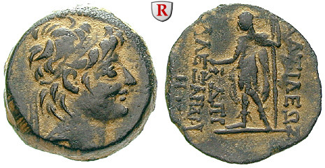 Alexander II. 128-123 v.Chr. Bronze 19 mm Jahr 184 = 128 v.Chr. Antiochia. Kopf r. mit Diadem / Dionysos l., hält Kantharos und stützt auf Thyrsos; l. Datierung DPR; außen Initialen ISI. SNG Spear 2375f.; sehr schön +