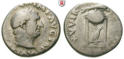 Zur Münzgeschichte: Die Münzstätte in Rom prägte erst vom 19. April an in Rom Münzen für Vitellius, an diesem Tag wurde er durch den Senat anerkannt. Das Geld, das Vitellius vorher benötigte, ließ er in Tarraco in Spanien und Lugdunum (Lyon) in Gallien prägen. Die Titulatur seiner Münzen weist einige Besonderheiten auf. Seit seiner Akklamation bezeichnete sich Vitellius als "Germanicus", diesmal nicht als Siegesname zu verstehen, sondern aufgrund seiner Erhebung in Germanien. Den Titel "Caesar" nahm er nie an und er erscheint auch nicht auf Münzen. Die Münzrückseiten betonen besonders den militärischen Aspekt der Treues des Heeres - FIDES EXERCITVVM - oder der Eintracht aller Bevölkerungsschichten - CONCORDIA. Sehr seltene Prägungen zeigen die Kinder des Herrschers - der zögerliche Versuch einer Dynastiegründung.