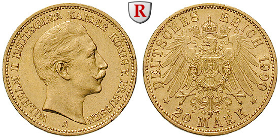 Wilhelm II. 1888-1918. 20 Mark 1900 A. J. 252; GOLD, sehr schön - vorzüglich, kl. Rdf.