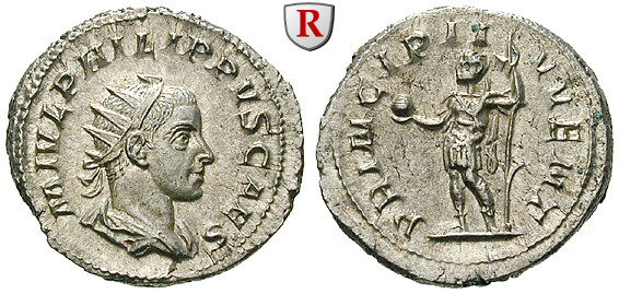 Zur Münzgeschichte: Schon als Caesar wurden für Philippus II. Münzen mit der Titulatur M IVL PHLIPPUS CAES geprägt. Die Aurei, Denare und Sesterzen zeigen eine barhäuptige Büste, da der Lorbeerkranz als Herrschaftssymbol nur dem Augustus zustand. Auf den Antoninianen trägt Philippus natürlich die Strahlenkrone, da sie hier das Nominal bezeichnet. Die Rückseitendarstellungen sind typisch für einen Caesar. Philippus II. zeigt sich als princeps iuventutis mit Globus oder Standarte und Speer als Herrschaftsattributen.