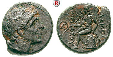 Antiochos I. 280-261 v.Chr. Bronze 16 mm Antiocheia. Kopf r. mit Diadem / Apollo sitzt l. auf Omphalos und hält Pfeil und Bogen, Monogramm im l. Feld. SC 206f.; sehr schön - vorzüglich