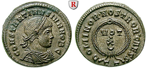 Zur Münzgeschichte: Die meisten erhaltenen Prägungen dieses Herrschers stammen aus seiner Regierungszeit als Caesar unter seinem Vater (317-337). Es sind vor allem Bronzemünzen, die in dieser Zeit immer kleiner werden (Inflation) und die in allen Reichsmünzstätten geprägt wurden. Die Münzen seiner Augustuszeit (337-340) sind seltener. Obwohl die Portraits flach geschnitten sind, treten die Züge auf gut erhaltenen Stücken scharf und individuell hervor.