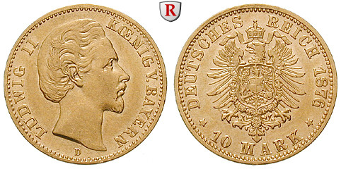 Ludwig II. 1864-1886. 10 Mark 1876 D. J. 196; GOLD, sehr schön +