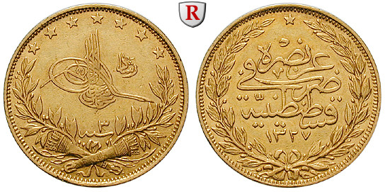 Mohammed V. 1909-1918. 100 Piaster 6,61 g fein, 1911 Konstantinopel. Jahr 3. Schl. 662; GOLD, sehr schön +