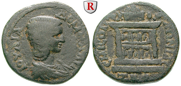 Julia Domna, Frau des Septimius Severus +217. Bronze 26 mm Jahr 527 = 215-216. Drapierte Büste r. mit Diadem / Großer Altar des Sonnengottes Elagabal. BMC 9; sehr schön