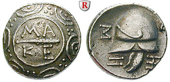 Autonome Prägung z. Z. Philipp V. u. Perseus 221-168 v.Chr. Tetrobol 14 mm 184-179 v.Chr. Pella oder Amphipolis. Makedonischer Schild, darauf Keule MA-KE / Makedonischer Helm, im Feld Monogramme. SNG Cop. 1282var.; fast vorzüglich