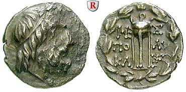 Hemidrachme 15 mm um 35 v.Chr. Magistrat Polykles. Kopf des Zeus r. mit Lorbeerkranz / Dreifuß im Lorbeerkranz. BCD Peloponnesos 753-754; sehr schön / sehr schön-vorzüglich, Korrosion auf Vs.