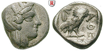 Drachm 14 mm about 410 BC. Head of Athena right, wearing Attic helmet / Owl standing right, head facing, olive sprig behind, all within incuse square. Svoronos Taf. 17, 29; good very fine