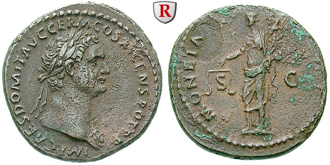 Domitian 81-96. Copper-As 27 mm 85 Rome. Laureate head right IMP CAES DOMIT AVG GERM COS XI CENS POT P P / MONETA AVGVST S C Moneta standing left, holding cornucopiae and scales. RIC 383; very fine to extremely fine / very fine