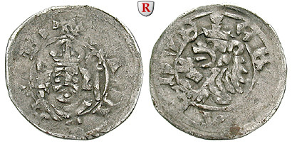 Gerhard von Schwarzburg 1372-1400. Denar 17 mm Würzburg. Drapiertes Brustbild von vorne mit Mitra, Krummstab und Schwert / Steigender Löwe l. mit Krone. Ehwald 5003; sehr schön, Druckstellen
