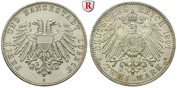 2 Mark 1901 A. J. 80; vorzüglich +, Reste von Zaponlack