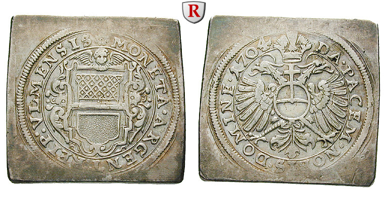 Guldenklippe 1704. Gepräge der bayerisch-französischen Besatzung während der kaiserlichen Belagerung. Verziertes Stadtwappen / Doppeladler. Stempel 28mm Durchmesser. Nau 156; sehr schön +