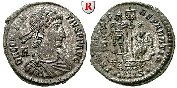 Eine der im Jahre 348 neu eingeführten Bronzemünzen zeigt, wie ein römischer Soldat einen gestürzten Reiter ersticht. Dieser ist aufgrund seiner Kopfbedeckung eindeutig als Perser ausgewiesen. Die Darstellung symbolisiert wohl Constantius II., den persischen König niederstechend.