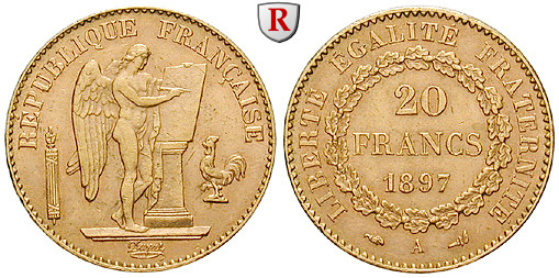 III. Republik 1871-1940. 20 Francs 5,81 g fein, 1897 A. Genius. Friedb. 592; GOLD, fast vorzüglich, kl. Kratzer und Rdf.