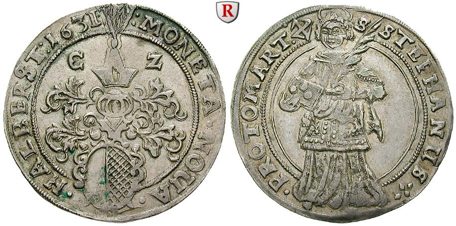 1/2 Taler 1631. Behelmtes Stiftswappen zw. Münzmeisterzeichen C-Z / Heiliger Stephan mit Buch und Palmzweig, Münzzeichen Stadthaken gekreuzt. Besser/Brämer/Bürger 45.68; vorzüglich