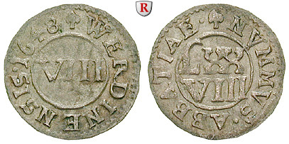 Heinrich IV. Dücker 1646-1667. 8 Heller 1648 Werden. Fettmännchen. Mzz. Blätter. Grote 41; fast vorzüglich