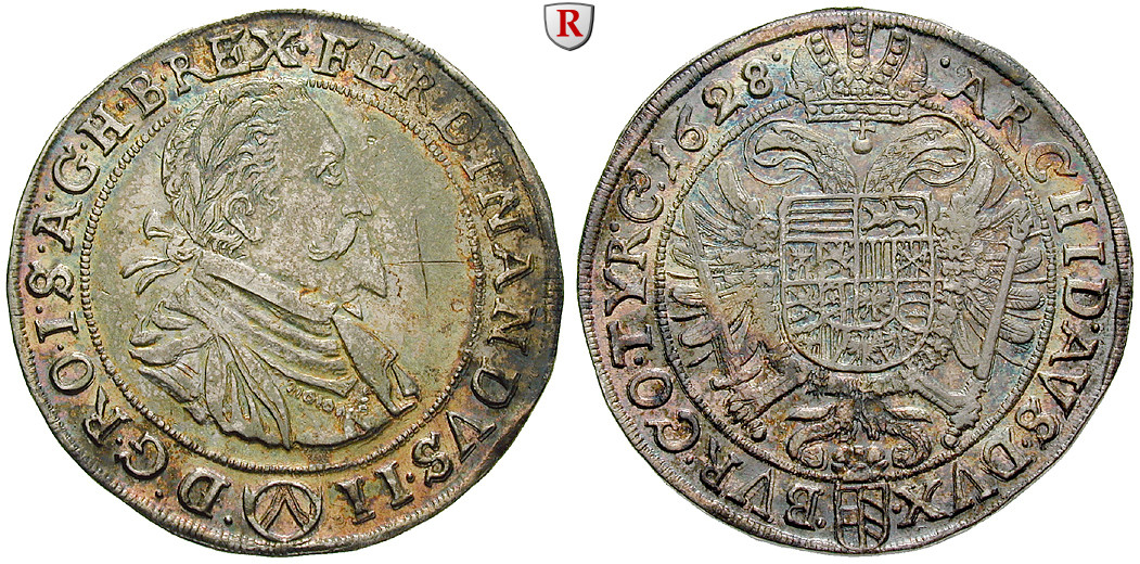 Ferdinand II. 1619-1637. Reichstaler 1628 Wien. Münzmeister Matthias Fellner. Brustbild r. / Gekrönter Doppeladler. Dav. 3091; fast vorzüglich, Sammlerz. auf Vs.
