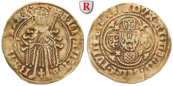 Reinald IV. von Jülich 1394-1423. Goldgulden o.J. (um 1415). Johannes der Täufer von vorn / Fünf kleine Wappen im Vierpass, in den Winkeln Dreiblätter. Friedb. 49; GOLD, sehr schön, Rdf.